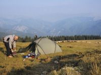 nemusím. Nicméně vylézám. Je pod mrakem. Stírám rosu ze stanu. Spacák