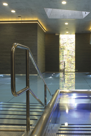 tunelů po schodišti do hypermoderní nové budovy, kde je bazén a o patro