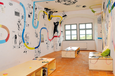 Nalezneme zde také odpočinkovou zónu s barevnou nástěnnou kresbou časové
