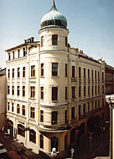 štukovou dekorací z druhé poloviny 18. století. Na třípatrový secesní