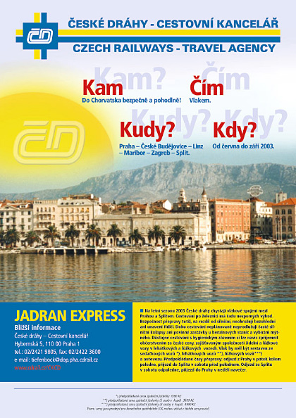 Na letní sezonu 2003 České dráhy chystají vlakové spojení mezi Prahou a Splitem. Cestování po železnici má řadu nesporných výhod, zejména pohodlí a bezpečnost přepravy.