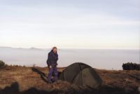 s korálky rosy. S výškou se jasní. Záhy je mlha pode mnou. Horská louka.
