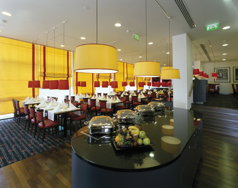prostředí od hotelového lobby přes hotelovou restauraci s letní slunnou