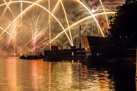 ozvučená tribuna. Ohňostroje lze zhlédnout i při nočních vyhlídkových