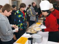 obrovského množství lidí u výdejních pultů s pokrmy, na sebe vážou