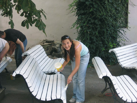 štětci a bruskami, aby pomohli natřít co možná nejvíce laviček a vrátit