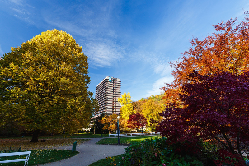 situován v samém srdci Karlových Varů, nedaleko sadů Antonína Dvořáka a