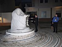dlážděné nádvoří, kterému vévodí netradiční kamenná kašna sochaře