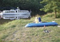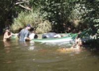 Lužnicí. Tam nafoukli loď a jeli. Přes řeku samé spadané stromy.