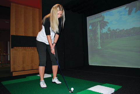 s kamarády hrát golf na dvou špičkových simulátorech Full Swing Golf.