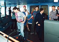 stewardi a odvádějí do kabin jednoho z nejluxusnějších trajektů mezi