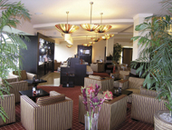 vínově zlatých klubovkách lobby a prosklenou stěnou vidíme do parku. Pane