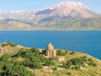 nosí jezero v Arménské vysočině na dohled mytického Araratu. Levan,