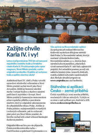 CzechTourism se připojil k oslavám výročí 700 let od narození českého krále a římského císaře Karla IV. Od 1. dubna 2016 si tak mohou nadšenci luštění tajných kódů vyzkoušet novou, zdarma přístupnou šifrovací hru „Královské mysterium“ po stopách Karla IV. na Novém Městě pražském.