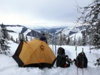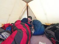 náporům vichru. Pokračovat? Nesmysl. Vyhloubili jsme ve sněhu díru pro stan