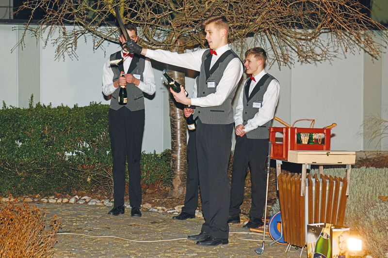 nádvoří školy a sabrage žáků věnujících se sommelierství. Následně