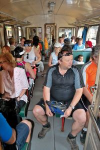 motoráček s ne zrovna pohodlným interiérem, dřevěnými lavicemi apod.