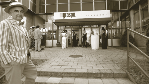 před tiskárnou vítali její zaměstnanci v dobových kostýmech. Spolu