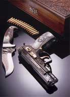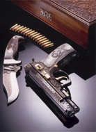 zbraně – pistole a revolvery. Pistole jsou v několika rážích a
