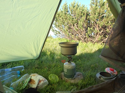 opravdu nacházím studánku. Stan stavím v kosodřevině s výhledem na