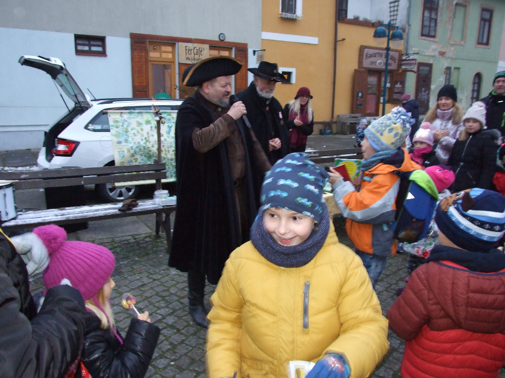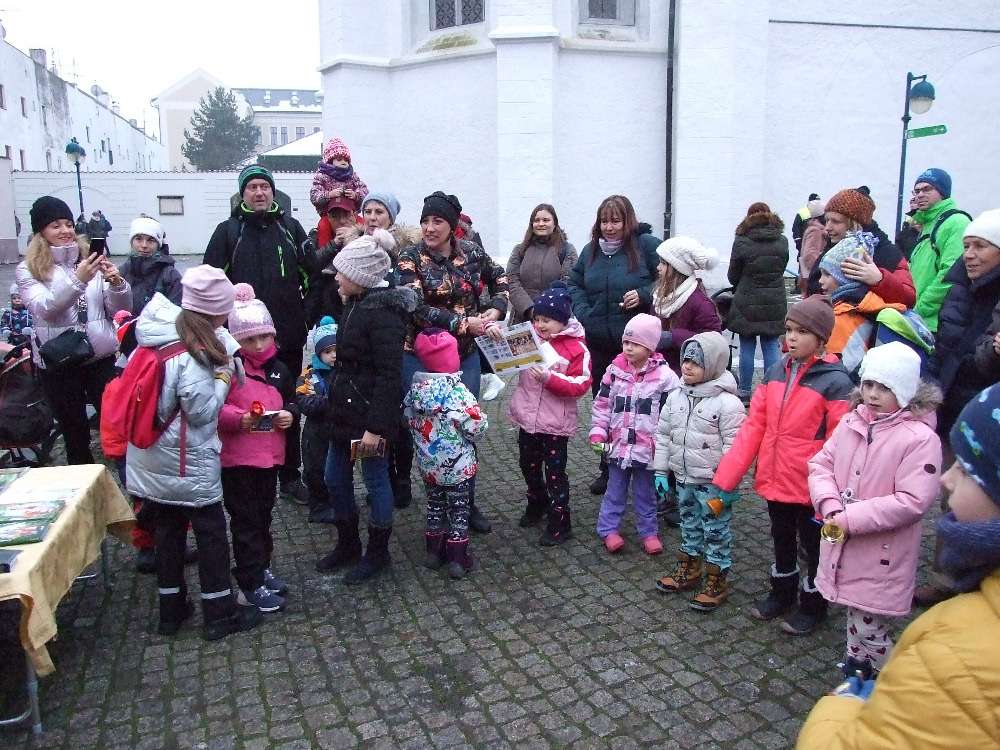 Zvonkové soutěže na Piaristickém náměstí proběhly od 15.30 do 16 hodin s odměnami – pohádkami Vyprávění kapra Jakuba, Rožmberské pasy, Turistické deníky z Wander Booku aj.