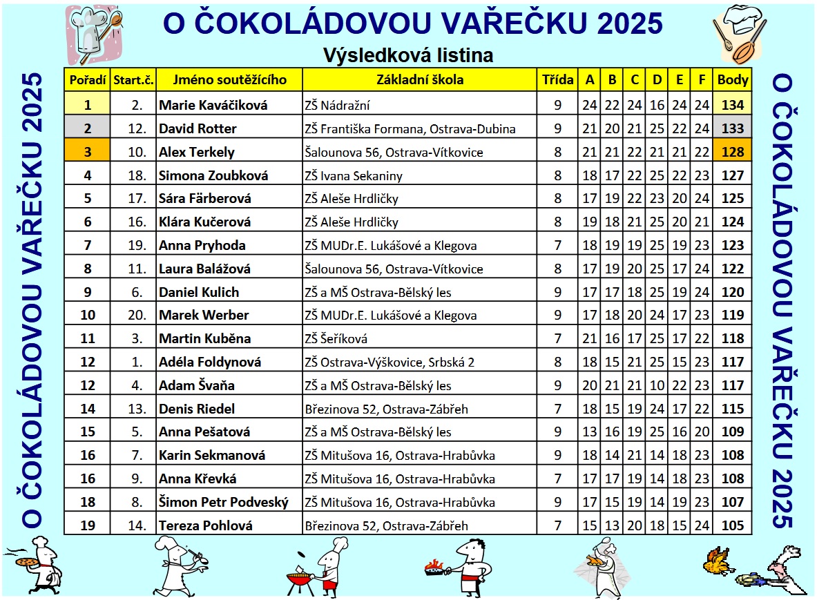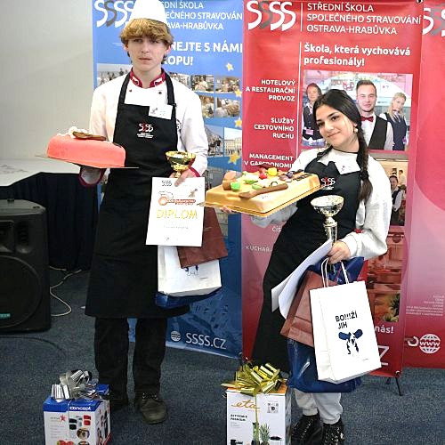 Letošní vítězkou soutěže se stala Marie Kováčiková, která z rukou místostarosty Úřadu městského obvodu Ostrava-Jih Martina Kreta si odnesla sladkou odměnu. Marie Kaváčiková ze Základní školy Nádražní v Ostravě připravila vepřovou panenku s dyňovým pyré, vinnou brusinkovou omáčkou a klíčky ze zeleného hrachu. Na druhém místě skončil David Rotter ze Základní školy Františka Formana, Ostrava-Jih s vepřovými špalíčky v cheddarové omáčce a bramborovým špízem. Ze třetího místa se radoval Alex Terkely ze Základní školy Šalounova, Ostravy-Vítkovice, který předvedl vepřovou panenku ve slanině a batátové pyré. Všichni soutěžící si kromě vzrušujících zážitků odnesli upomínkové dárky a pamětní list. Připravila Hana Schwarzová.