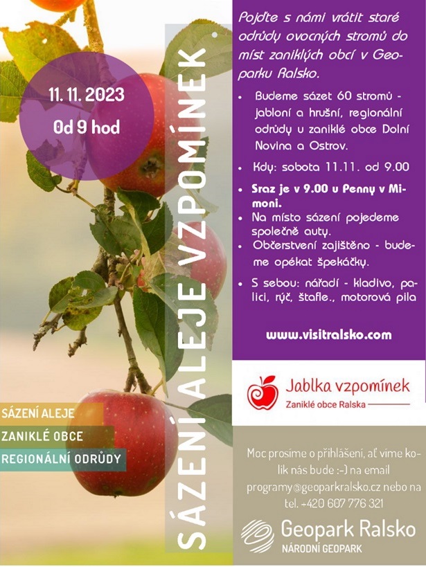 Projekt Alej vzpomínek má za cíl obnovit historické aleje v místech zaniklých obcí a zároveň zachránit místy unikátní regionální odrůdy jabloní a hrušní. Je málem neuvěřitelné, co vše dokázaly staré stromy, jež bývalým hospodářům poskytovaly stín a ovoce, bez veškeré péče přežít. Bez mála půlstoletí působení tří různých armád, které srovnaly se zemí více než 17 obcí včetně kostelů a hřbitovů. A další tři desítky let života v divočině. Nyní mají prostřednictvím naroubovaných stromů šanci vrátit se v plné síle tam, kam patří. Národní Geopark Ralsko pokračuje ve výsadbě Aleje vzpomínek na památku zaniklých obcí v bývalém vojenském prostoru. Letos vysází s dobrovolníky 60 nových stromů – vysokokmenů s naroubovanou regionální odrůdou jablek nebo hrušek. Celkem bude mít nová alej, která vzniká již od roku 2019, celkem 160 stromů.