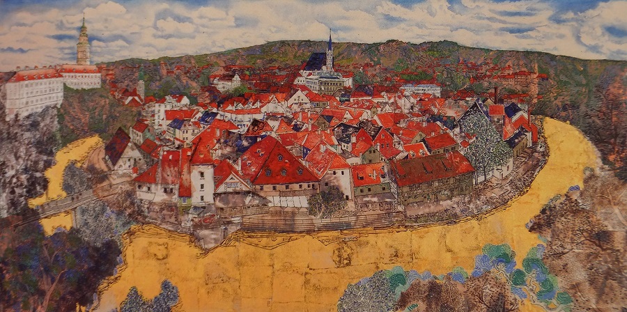 Pro návštěvníky budou zajímavostí obrazy zachycující známé dominanty Prahy ztvárněné použitím tradiční tušové techniky. Vysoce ceněné jsou zejména obrazy doplňované malbou ryzím zlatem. Této cti se dostalo jedinému obrazu výstavy s motivem Českého Krumlova. Jak téma výstavy napovídá – po staré i současné Hedvábné stezce se vydali čínští umělci, aby ve svých dílech ztvárnili tradiční i soudobé motivy ze života obyvatel, či architekturu měst, místa ze Staré Číny a dalších zemí. Kombinací moderních technik i striktní tušové malby zobrazili svébytným způsobem jiná, pro ně vzdálená místa v zemích odlišných kultur. V letošním roce byla tato díla již k vidění v Řecku, na Maltě a ve španělské Barceloně, odkud byla převezena do Prahy.