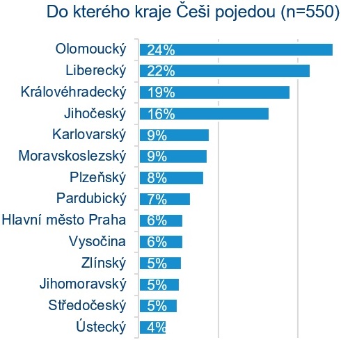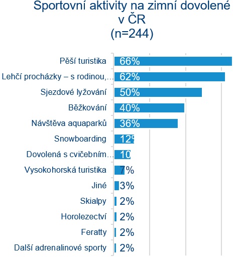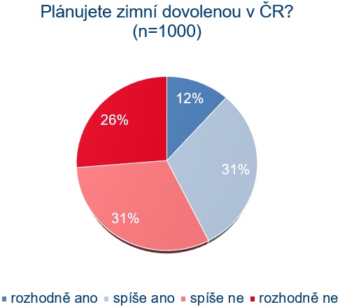 Strávit zimní dovolenou v Česku plánuje podle listopadového průzkumu agentury CzechTourism 43 % Čechů. Podle průzkumu* bude zimní dovolená trvat nejčastěji osm dní a Češi za ní plánují utratit zhruba šest a půl tisíce korun na osobu z toho téměř polovinu za ubytování. Nejčastější aktivitou během dovolené budou procházky a pěší turistika, sjezdové i klasické lyžování doplněné o návštěvu aquaparku. Téměř čtvrtina z těch, kteří plánují zimní dovolenou v ČR, plánuje navštívit Olomoucký kraj (24 %), více než pětina Liberecký kraj (22 %) a další pětina Královéhradecký kraj (19 %). Nejoblíbenějším typem ubytování jsou penziony.