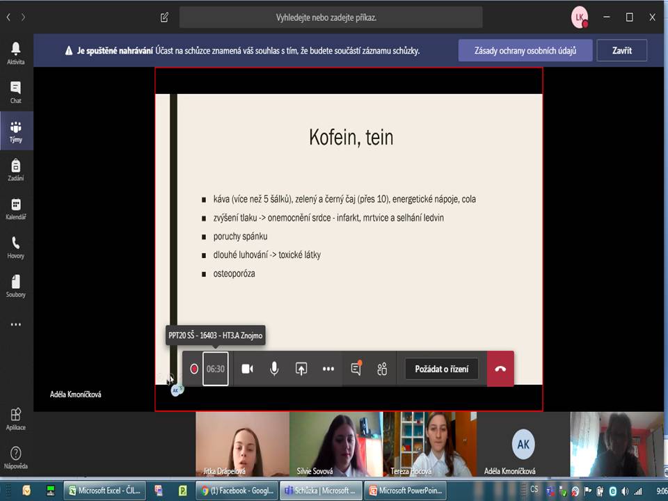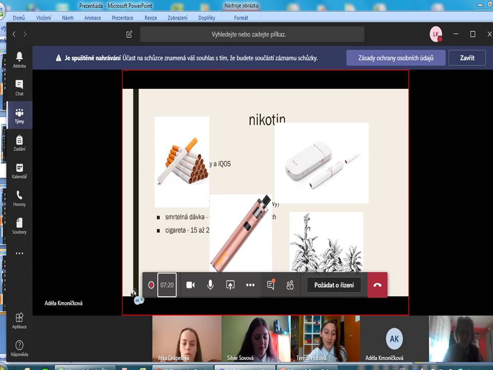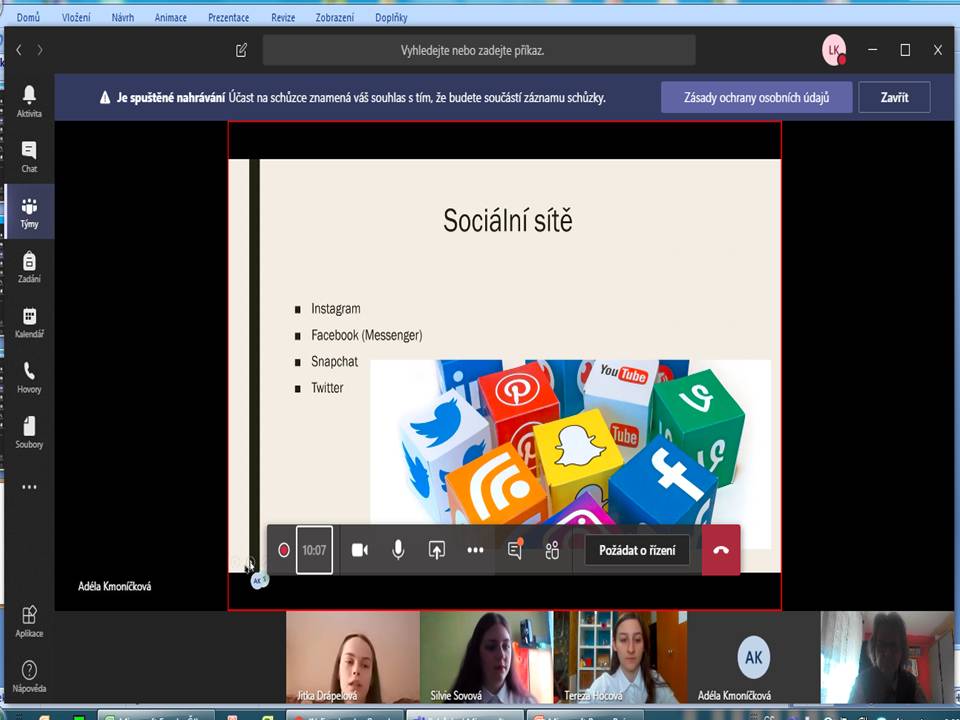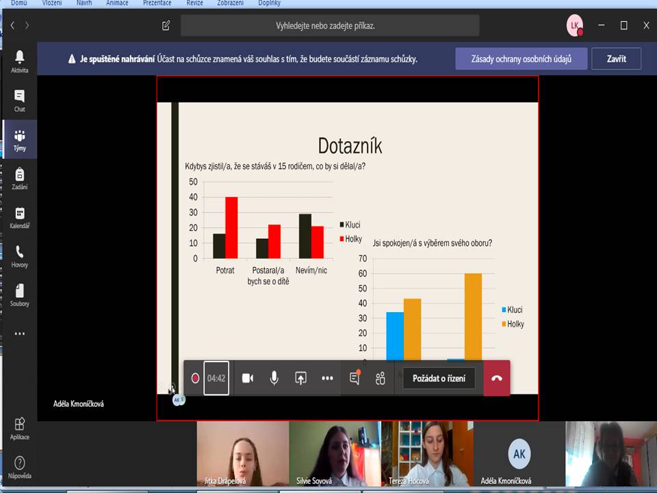 Je pondělí 6. dubna, 8:30 hodin. Všechna 3 děvčata ještě pilují, co je třeba doladit. Chtějí být 100% připravené. 8:45 - Teams je moderátorkou spuštěn. Všechny jsou připraveny. Moderátorka, učitelka, 2 soutěžící… 3. soutěžící se najednou odmlčela. Bydlí v Hrádku a vypadl tam kvůli opravě silnice proud. Námět pro pořad To nevymyslíš… Nic se neděje. Moderátorka je vstřícná, operativně se s týmem domlouvá na jiný termín. Je potřeba se sladit, vždyť online probíhá i výuka ve škole… Je vyhráno. Druhý pokus nahrávání proběhne ve středu 8. 4. 2020 v 9:00 hodin. Doufejme, že proud bude!