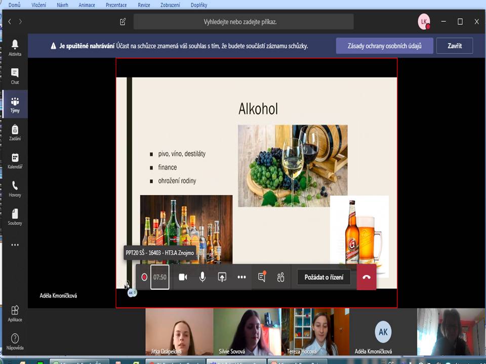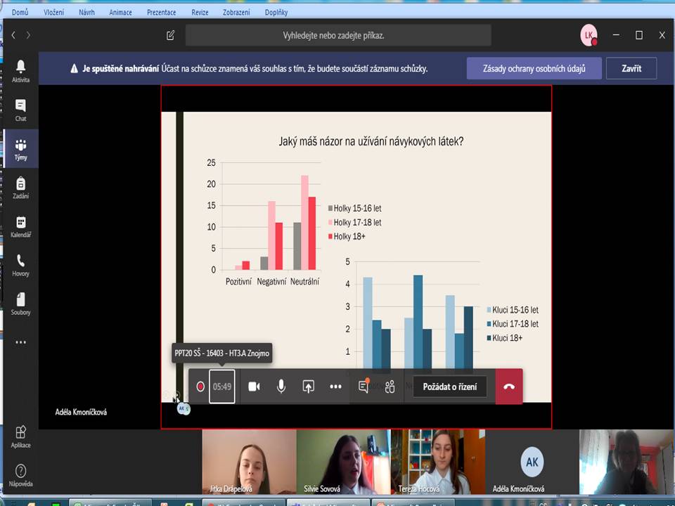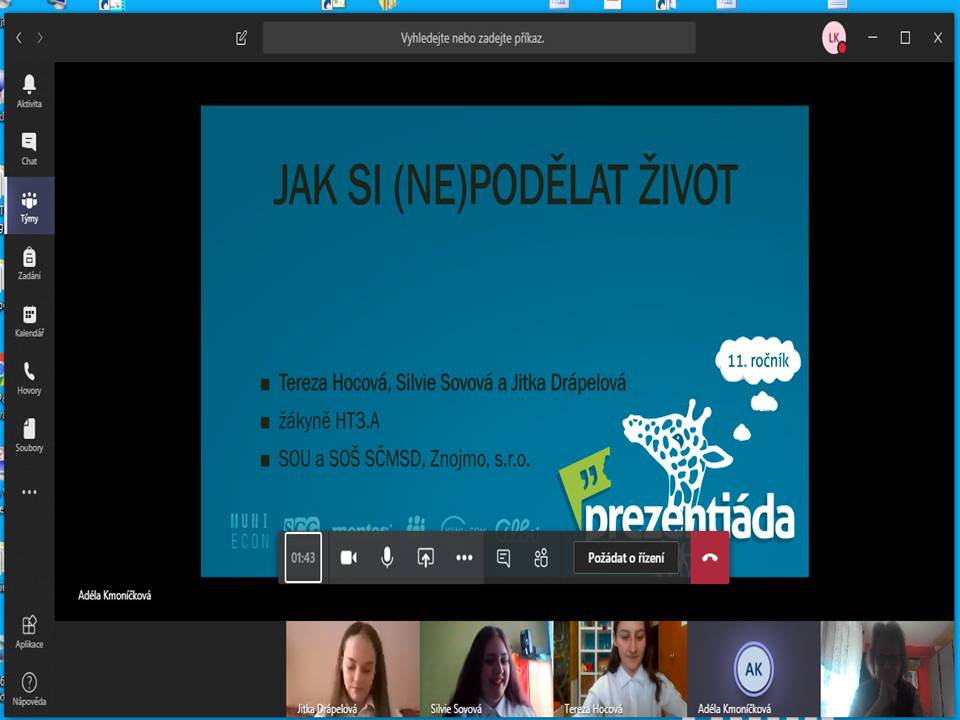 Silvie Sovová, kapitánka mužstva: "Dne 8. 4. 2020 jsem se společně s Terezou a Jitkou zúčastnila online krajského kola soutěže Prezentiáda. Už do školního kola jsme si zvolily téma “Jak si (ne)podělat život”. Vytvořily jsme prezentaci reflektující výsledky dotazníků, které jsme získaly v naší škole. Těšily jsme se na krajské kolo do Brna, na to, jak si s tématy poradily ostatní týmy. Bohužel, neměly jsme možnost soupeře vidět, kolo se kvůli současné situaci a nouzovému stavu ČR uskutečnilo online, pomocí aplikace MS Teams. Náš původní termín bylo pondělí, 6. 4., ale vyskytl se problém. Ve vesnici, kde bydlí Tereza, opravovali silnici tak poctivě, že bagrem překopali elektrické vedení. Musely jsme tedy naše vysílání přeložit, a to na středu, 8. 4. To už naštěstí vše fungovalo a prezentovaly jsme, řekla bych, dobře. Co naštěstí nikdo nezpozoroval a co pro mě bylo nepříjemné, tak posledních pár minut, kdy mi moje kočka začala škrábat na dveře a mňoukat. Moderátorka mě ujistila, že to prý nebylo slyšet. Jinak za cely náš tým si dovolím říct, že se nám prezentace povedla. Bohužel jsme nemohly dát porotě naše dotazníky a všechny rekvizity, kterými jsme naše prezentování měly doplnit, ale i tak jsem s naším výsledkem spokojená."