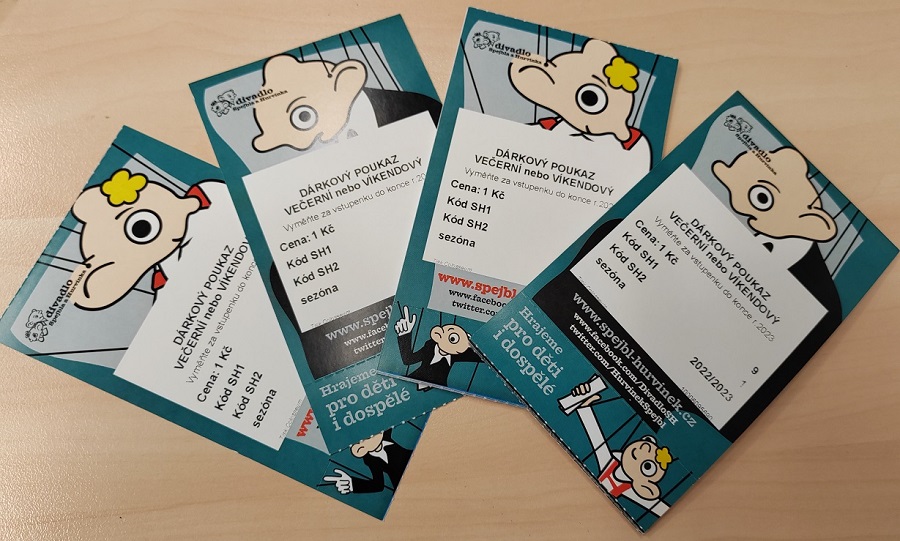 V pokladně Divadla S+H lze zakoupit „dárkové vstupenky“ – to jsou dárky, které se nikdy neomrzí. Cena jednoho poukazu je 250 Kč a každý zájemce si jich může koupit libovolný počet. Poukaz lze vyměnit za vstupenku buď na rodinné víkendové představení, nebo na představení pro dospělé. Platnost má až do konce roku 2023, nikdo se tedy nemusí bát, že by si nestihl vybrat představení. V pokladně navíc seženete drobné dárečky, které potěší srdce každého fanouška našeho divadla.