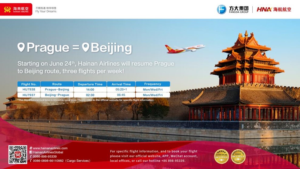 Praha opět získá přímé spojení s Čínou. Dopravce Hainan Airlines od 24. června obnoví svoji přímou linku z Prahy do Pekingu, kterou bude celoročně provozovat třikrát týdně vždy v pondělí, ve středu a v pátek. Návrat přímých letů do Číny je velmi dobrým signálem pro příjezdový cestovní ruch i pro české cestovatele.