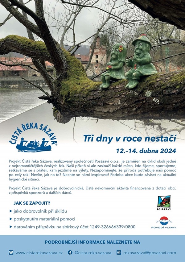 Stejně jako v předchozích 18 letech vyjdou a vyjedou i letos dobrovolníci k řece Sázavě, aby z jejích břehů sesbírali vše, co na ně nepatří. Tradiční akce Čistá řeka Sázava se uskuteční od 12. do 14. dubna. K účasti je třeba se předem přihlásit na www.cistarekasazava.cz – online registrace už byla spuštěna. Do loňského úklidu řeky Sázavy a jejích přítoků se zapojilo celkem 1 768 lidí, kteří sesbírali 17 tun odpadků.