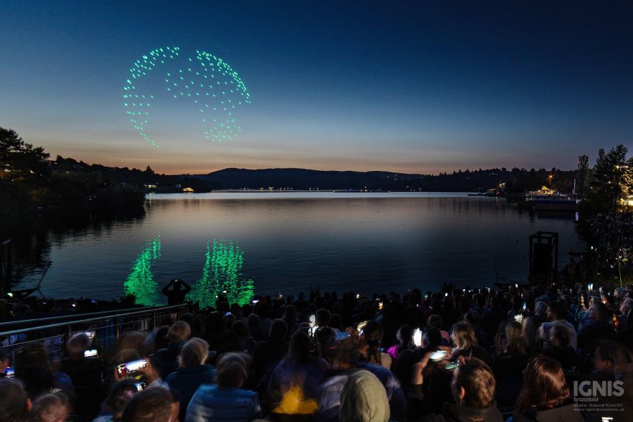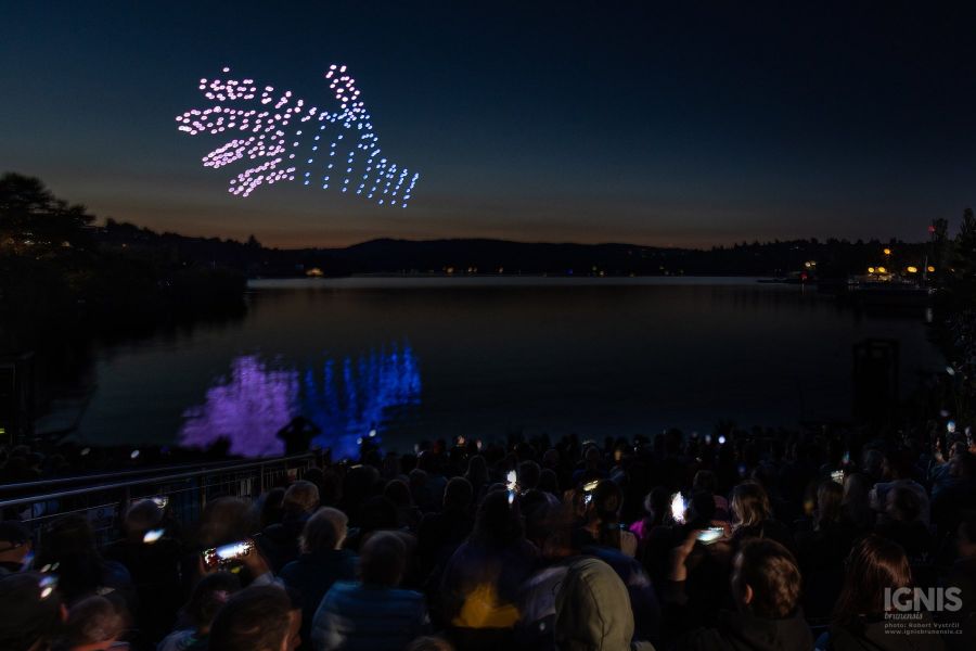 Druhá dronová show letošního ročníku Ignis Brunensis připomněla revoluční objevy lidstva: od páry přes elektrické osvětlení nebo první cestu na Měsíc až po umělou inteligenci
