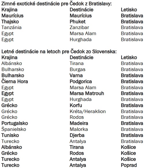 Čedok už predstavil rozšírenú ponuku odletov zo Slovenska na túto letnú sezónu. Pre Bratislavu pripravila cestovná kancelária celkovo šesť noviniek. Z hlavného mesta si teraz môžu cestujúci naplánovať svoj pobyt a letieť priamo do egyptského letoviska Marsa Matrouh pri Stredozemnom mori, na grécky ostrov Korfu, portugalskú Madeiru, tuniskú Djerbu, ako aj do bulharskej Varny. Aj naďalej sa bude lietať do čoraz viac obľúbeného Albánska, na Malorku a Krétu. Slováci si môžu vybrať aj zájazdy do Čiernej Hory vďaka pravidelným letom z Bratislavy do Podgorice. Novinkou na Slovensku je aj turecká Antalya priamo z Popradu, Rodos či Tirana z Košíc, odkiaľ pokračujú zájazdy do Turecka. ďalšie možnosti sú tiež na zájazdoch do tureckého Dalamánu alebo na ostrov Fuerteventura z neďalekého Brna. Celkovo môžu dovolenkári len zo Slovenska cestovať priamymi letmi do takmer dvadsiatich destinácií, pričom v letnom predpredaji sú najobľúbenejšie Albánsko, Turecko, Grécko, Tunisko alebo Bulharsko. Slováci si na svoju dovolenku radi vyberajú aj z ponuky poznávacích zájazdov. Cestovatelia z Bratislavy sa môžu vybrať napríklad na predĺžený víkend do Londýna alebo na plavbu loďou po Níle s pobytom pri mori v Egypte, z Košíc sa môžu vydať farebnými vlakmi na známe vrcholy Švajčiarska alebo na predĺžený víkend do Dublinu. Zo susednej Viedne sú k dispozícii aj poznávacie zájazdy od krás severnej Európy cez Soul v Južnej Kórei až po Čínu s plavbou po Troch roklinách.