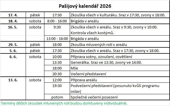 Hrát se bude 6. června od 20.30h a 13. června od 19.30h. Organizátoři tyto dny pro návštěvníky vyšperkovali – v tamním kostele svaté Kateřiny se například koná bohoslužba, koncert souboru Musica Bohemica, jejíž principál Jaroslav Krček složil hudbu pro Hořické pašijové hry. V Plánu je také komentovaná prohlídka Jana Palkoviče, který je spoluautorem rozsáhlé publikace o historii pašijových her. První zkouška se koná v pátek 17.dubna v 17:30 v tamním kulturním domě.