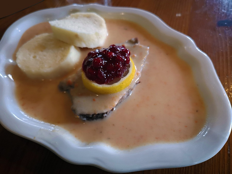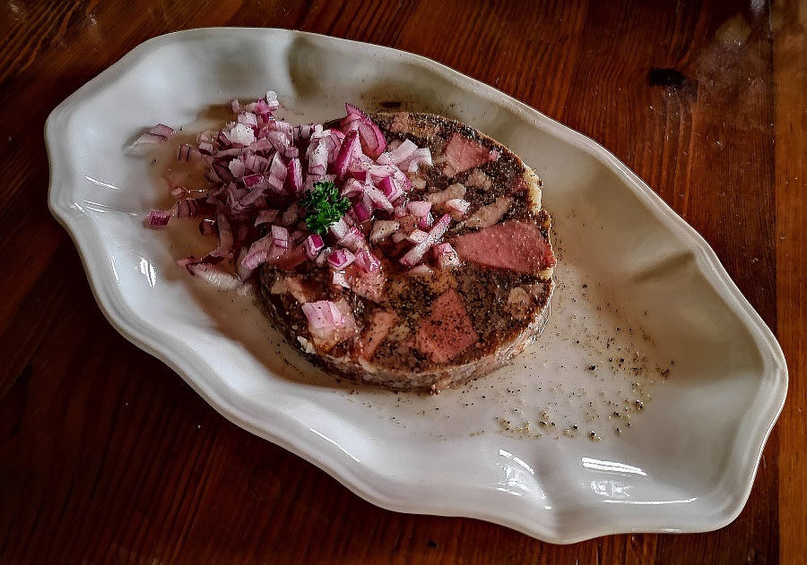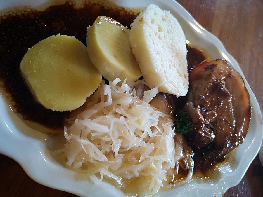 A ona trojice úhelných receptur, které se v roce 1918 staly základními kameny české kuchyně? Po mimořádné hovězí polévce s masem snad z půlky krávy a hromadou nudlí, v chuti úžasné, se budete těžko rozhodovat. Ať ale zvolíte cokoliv, nezmýlíte se. Kus kolena jako pro tři, s knedlíkem a zelím, má jasná pravidla. Hodně přírodní nezahuštěné zelí – aby umravnilo tuk z voňavého masa zdravě krmeného vepříka, řádná louže výpeku a dva druhy knedlíků. Guláš, ten nese stopu svých předchůdců z předrevolučních dob, takže má zvláštní, lehce zastřený projev bez stopy po ohnivé maďarské verzi. Daněk se jen rozpadá, protože je k dostání celoročně, bude zřejmě farmovaný. Proto je hodně těžké, až nemožné, rozkrýt v jeho chuti dotek divočiny. Možná ale v sezóně lovů, kdo ví…