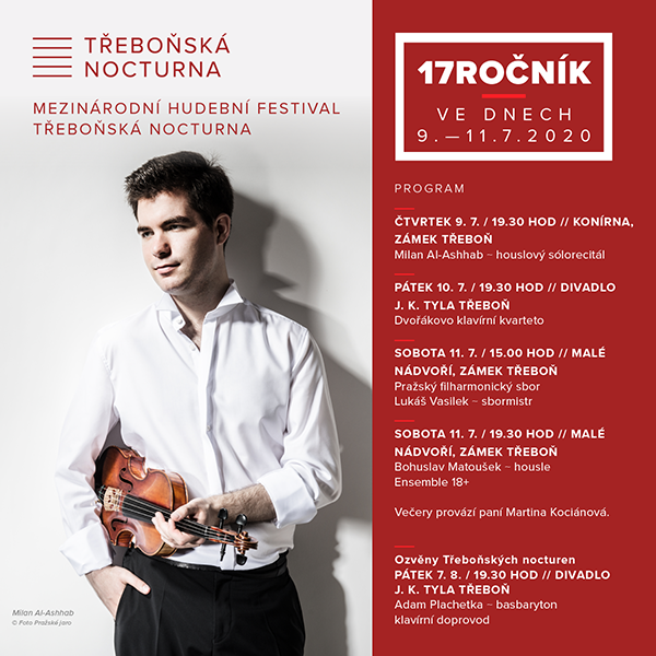 Zahajovací čtvrteční koncert se již tradičně uskuteční v Konírně zámku Třeboň. Pozvání přijal jeden z našich nejlepších mladých houslistů, Milan Al-Ashhab. Po vystoupení slečny Šroubkové a pánů Špačka, Mráčka a Vodičky v minulých letech, se budeme moci přesvědčit o virtuozitě umělce a skvělém citu pro uváděná díla. V sólovém vystoupení přednese díla J. S. Bacha, E. Ysaÿe, M. Regera a dalších skladatelů.