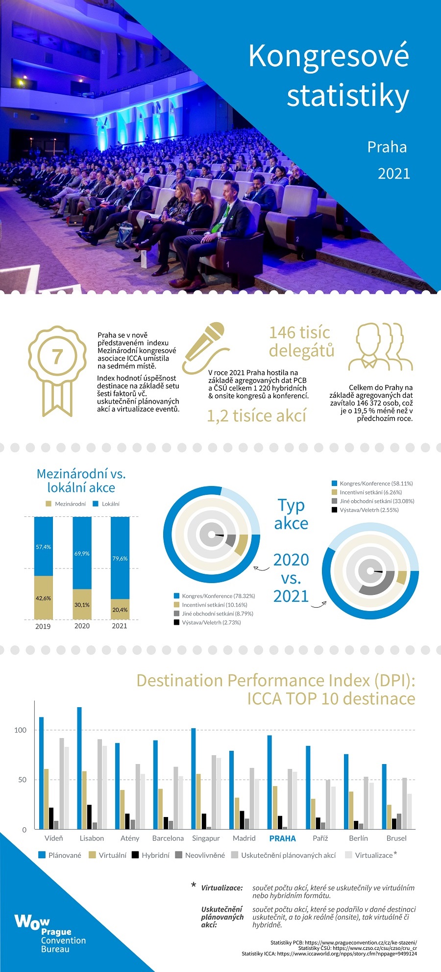 V Praze se podle agregovaných dat Prague Convention Bureau (PCB) a Českého statistického úřadu (ČSÚ) konalo v roce 2021 celkem 1 220 akcí, což je o 2,9 % méně než v roce 2020. Oproti rekordnímu roku 2019 se jednalo dokonce o propad o 79,5 %. Pandemie se významně podepsala především na počtu delegátů, kteří se těchto akcí zúčastnili. Meziročně jejich počet v roce 2021 poklesl z téměř 182 000 na 146 000, což je o 19,5 % méně.