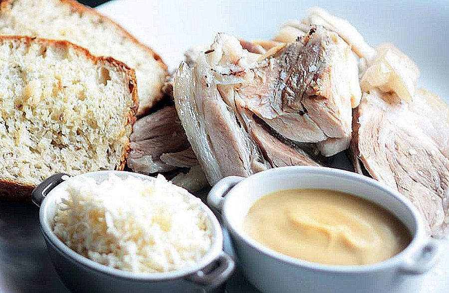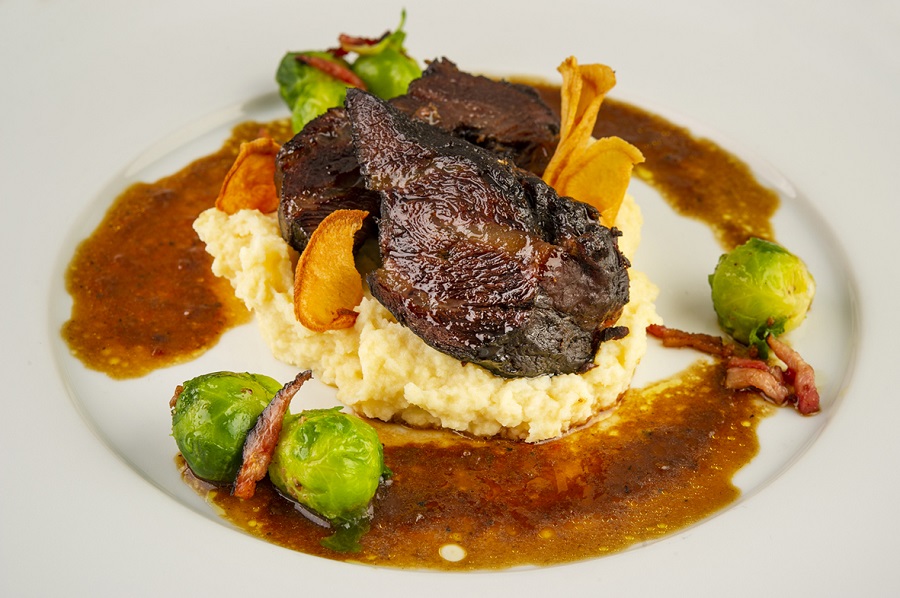 Krémová polévka z pečeného česneku s majoránkou a krutony, pomalu pečené vepřové na houbách, pečená morková kost, hovězí tomahawk, to je výběr z nabídky novoročního brunche restaurace The Eatery.