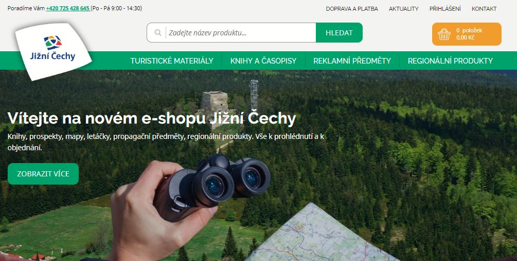 Jihočeská centrála cestovního ruchu (JCCR) spustila do plného provozu nový internetový obchod s turistickými předměty a potřebami. Zájemci zde za mimořádně příznivé ceny získají pohlednice, mapy, průvodce, knihy, klíčenky, klobouky, trička a další turistické a propagační materiály, brzy i typické regionální produkty, tematicky zaměřené na jižní Čechy. E-shop funguje na adrese: https://eshop.jiznicechy.cz