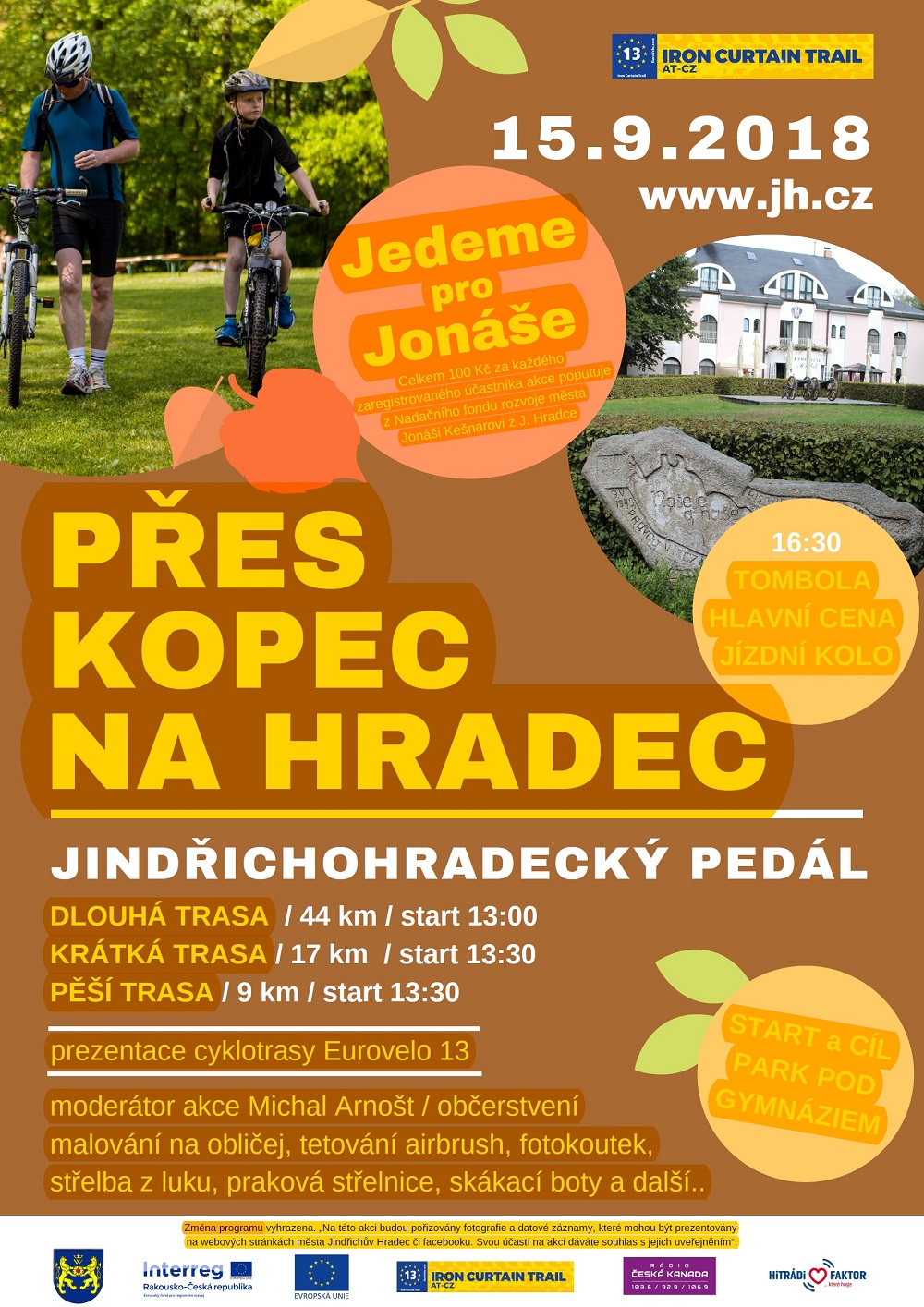 Letošní mimořádně slunečnou a horkou hlavní turistickou sezónu v okolí města nad Vajgarem ukončí v sobotu 15. září v Jindřichově Hradci už tradiční cyklistický výšlap Přes kopec na Hradec, aneb Jindřichohradecký pedál. Oblíbenou akci, se startem i cílem na hřišti pod Gymnáziem Vítězslava Nováka, si spolu s příznivci cyklistiky užijí samozřejmě také pěší turisté. Jindřichohradecký pedál se tentokrát uskuteční za podpory Jihočeské centrály cestovního ruchu (JCCR) v rámci přeshraničního projektu „Kultura a příroda na zeleném pásu“, ATCZ74, který má za cíl propagaci dálkové cyklotrasy Eurovelo13 na území Jižních Čech a Jižní Moravy na české straně, na území Rakouska pak vede destinací Waldviertel a Weinviertel.