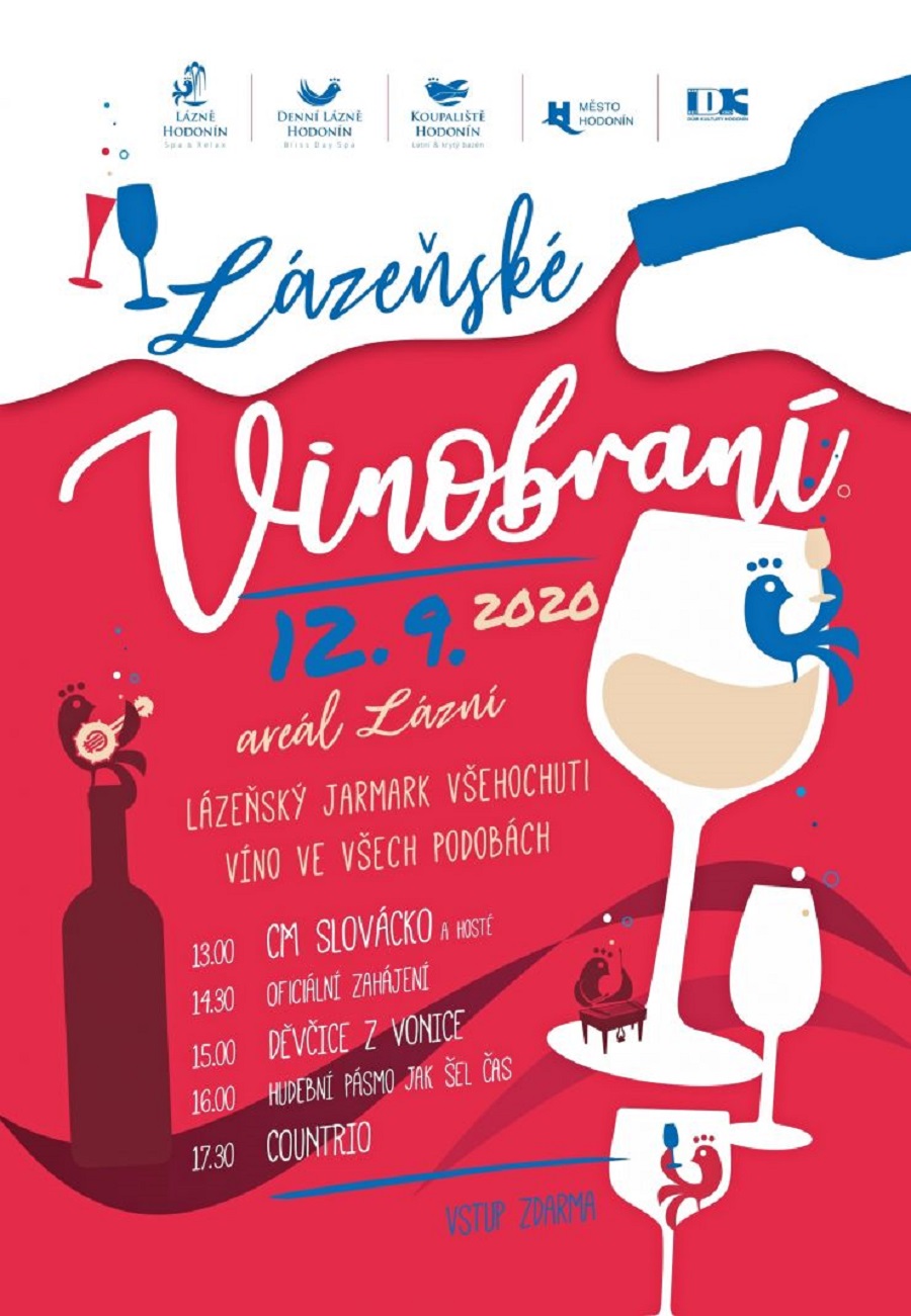12. září 2020 od 13 hodin pořádají Lázně Hodonín Lázeňské vinobraní. Jako každým rokem, tak i letos se tak můžete těšit na slavnosti vína s jarmarkem, cimbálovkou SLOVÁCKO a jeho hosty. Vinobraní s kulturním programem, žehnáním vína a přáním dobré úrody se koná se v areálu lázní. Oficiální zahájení vinobraní bude ve 14 hodin.