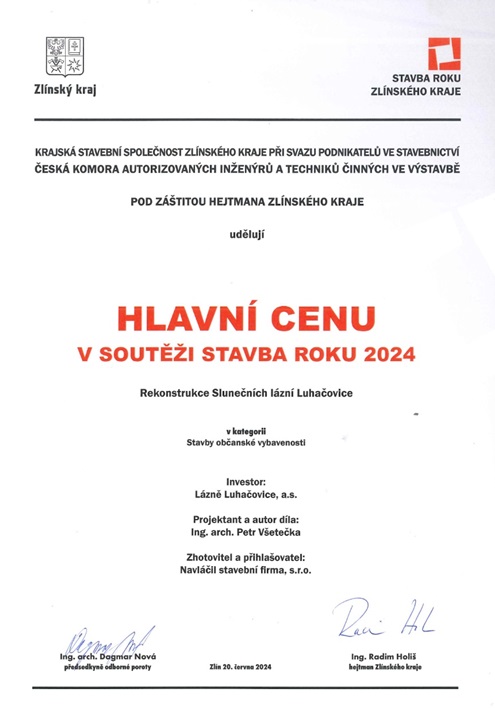 Lázně Luhačovice, a.s., se mohou pochlubit prestižním oceněním Stavba roku Zlínského kraje 2024. Hlavní cenu v kategorii Stavby občanské vybavenosti převzal ve čtvrtek 20. června 2024 v Kongresovém centru Zlín generální ředitel společnosti Ing. Jiří Dědek, MBA, za rekonstrukci Slunečních lázní v Luhačovicích.