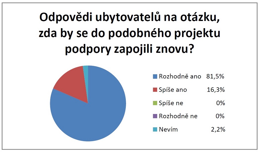JCCR v současné době vyhodnocuje první výsledky průzkumu mezi všemi 314 do projektu zapojenými ubytovateli. Z 92 dosud došlých odpovědí například vyplývá, že v budoucnu by se do podobného podpůrného projektu znovu zapojilo rozhodně ano 75 a spíše ano 15 ubytovatelů. Dva neví. Ne, neodpověděl nikdo.