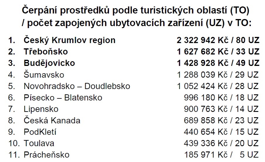 „Do projektu se zapojilo celkem 314 ubytovacích zařízení, z nichž 233 čerpalo kompenzace za poskytnuté slevy. Celkově bylo za předložené doklady proplaceno 11 372 777 korun. Celkem bylo vydáno a využito téměř pět tisíc voucherů, na jejichž základě získalo slevu téměř 15 tisíc ubytovaných hostů,“ zdůraznila vedoucí oddělení domácího cestovního ruchu JCCR Klára Kaštylová.