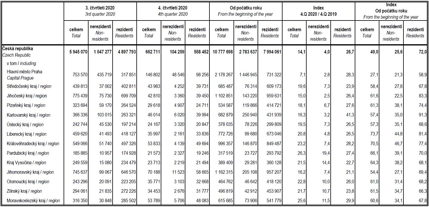 Nižší čísla ubytovaných hostů ale hlásí všechny kraje. V hlavním městě Praze se počet ubytovaných snížil o 79 % oproti roku 2019, což představuje pokles o necelých 6 milionů osob. Drastické úbytky hostů zaznamenaly regiony dlouhodobě orientované na zahraniční klientelu, zejména Karlovarský a Jihomoravský.