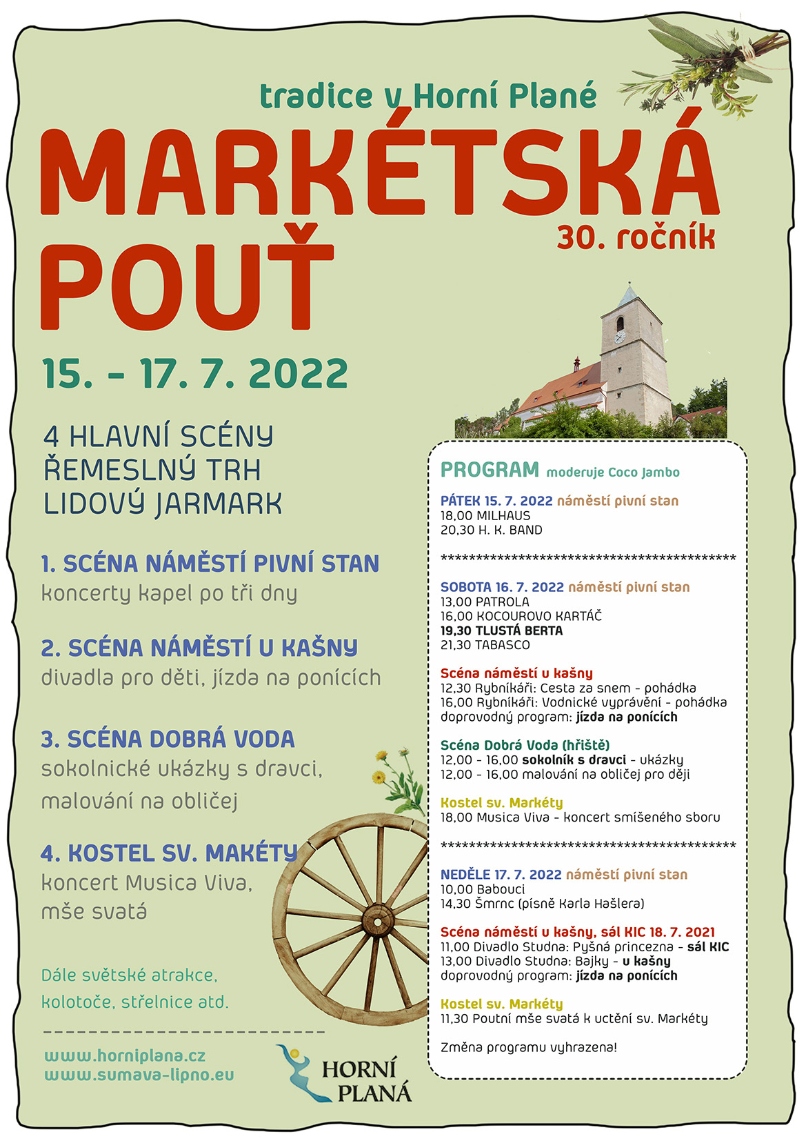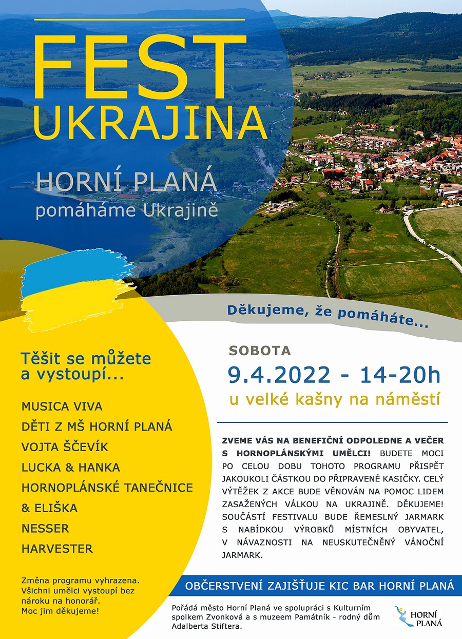 V Horní Plané se 9. dubna se koná Fest Ukrajina, celý výtěžek z hudebního festivalu pomůže Ukrajině. Následuje akce 7 dní na kole a s ní spojené zahájení cyklistické sezóny (14.5.), Dětský den (28.5.), Zahájení turistické sezóny a letecko-modelářský den (11.6.), 150. výročí hasičů Horní Planá (25.6.). Celé prázdniny bude tradičně promítat Letní kino Horní Planá. Po dvouleté pauze bude 15. července začínat 30. ročník tradiční Markétské pouti. Každou středu v červenci se bude na náměstí střídat divadelní představení pro děti či dospělé s koncertem. V hornoplánském letním kině začíná sezóna tradičně filmem pro děti, které dostanou za vysvědčení zdarma. „Promítat budeme pohádku Chikova cesta. Hudební sezónu začneme na Letním kině s pražskou kapelou Crazy Dogs 24. června,“ uvedla Lucie Roubínová. V plánu je také traktoriáda a festival regionálních minipivovarů Septembeer Fest.