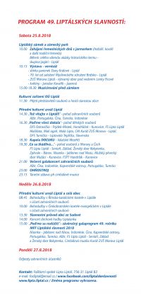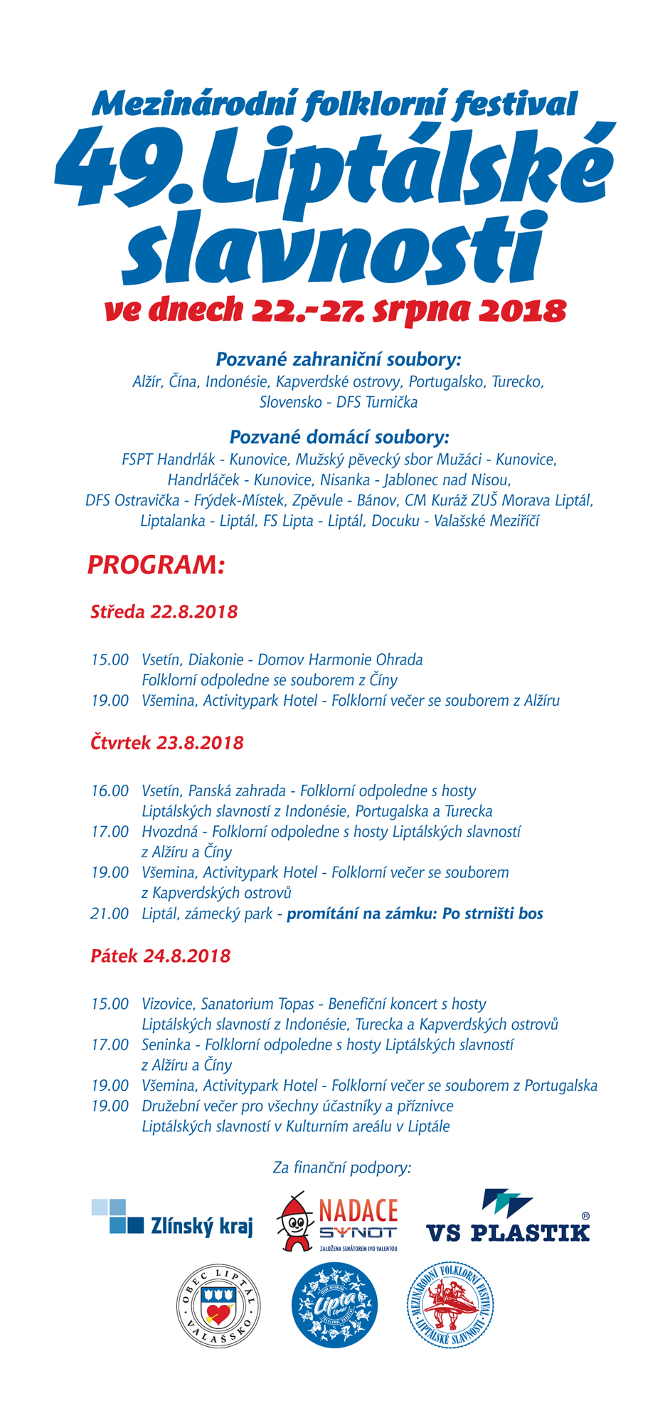 49. Mezinárodní folklorní festival Liptálské slavnosti pořádají Folklorní spolek Lipta Liptál, Obec Liptál, Zlínský kraj, Folklorní sdruženi České republiky a Evropská unie umění. Generálním sponzorem je firma VS PLASTIK, s.r.o. Mediálně akci podporují týdeník Jalovec a Valašský Deník. Připravil Zdeněk Pšenica.